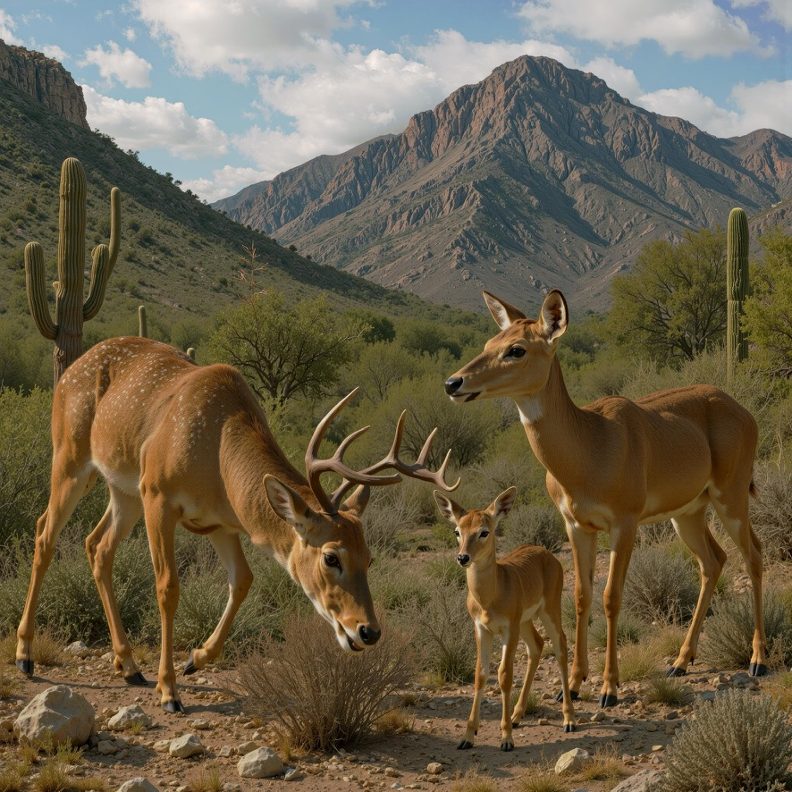 A buck, doe, and fawn move through the Catalina foothills in the warm light of a desert afternoon. The buck has his head down, grazing with the relaxed attention of an animal that feels safe. The doe stands watchful beside him — not alarmed, just attentive, the way does are when there is a fawn nearby. The fawn looks out toward the sunlit ridges of Pusch Ridge with the particular curiosity of something still new to the world. Saguaros rise around them, and the rugged terrain of the Catalina foothills fills the background with the warm tones of a desert afternoon doing what it does best.