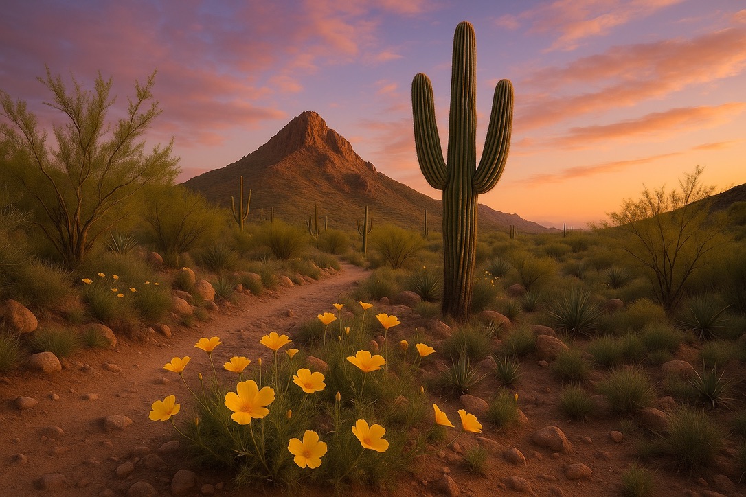 Desert Gold finds one of those trails at the end of the day. A cluster of golden poppies lines the path as it leads toward a saguaro silhouetted against an evening sky going pink, peach, and soft purple at the horizon. Ocotillo and palo verde frame the scene, and a mountain peak catches the last warm alpenglow in the background. The light is the particular quality of desert twilight — warm, diffuse, and brief.