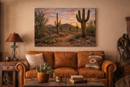 Desert Trail captures that hour. The saguaros anchor the composition with the authority that comes from a century or more of standing in one place, while the trail itself draws the eye forward through the scene and into the open desert beyond. The light is warm and specific — not a generic sunset, but the particular quality of a Sonoran afternoon giving way to evening, the kind that photographers and painters have always found worth chasing in this landscape.