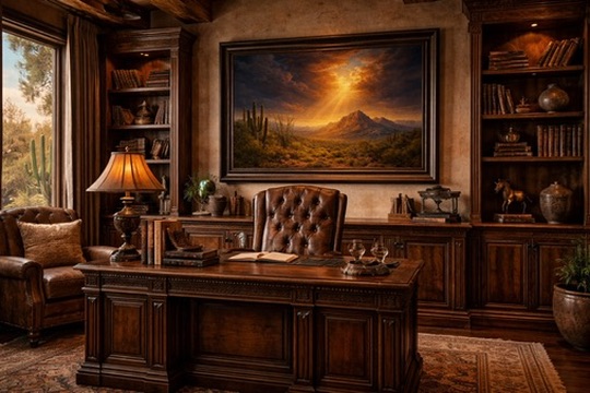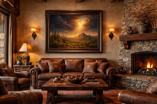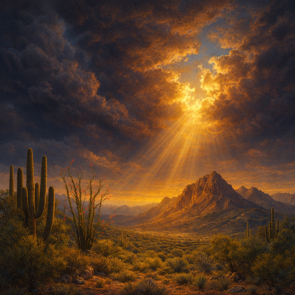 There are moments in the desert when the sky opens, and the light comes down as if by design. Storm clouds pull apart, a single granite peak catches the first shaft of sun, and the saguaros below seem to stand a little straighter. It is the kind of light that stops conversation. Divine Light Over the Desert is built around that moment.