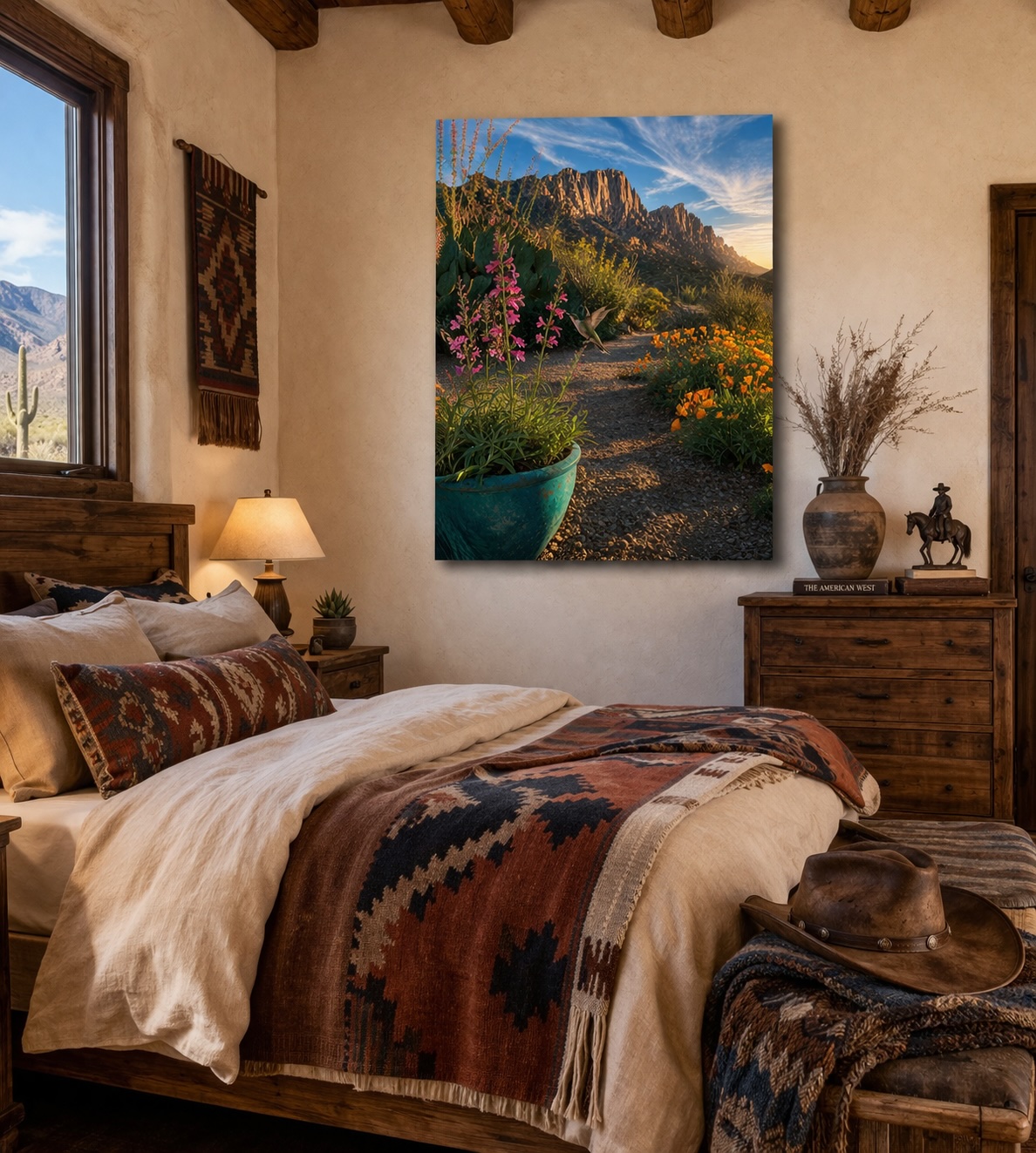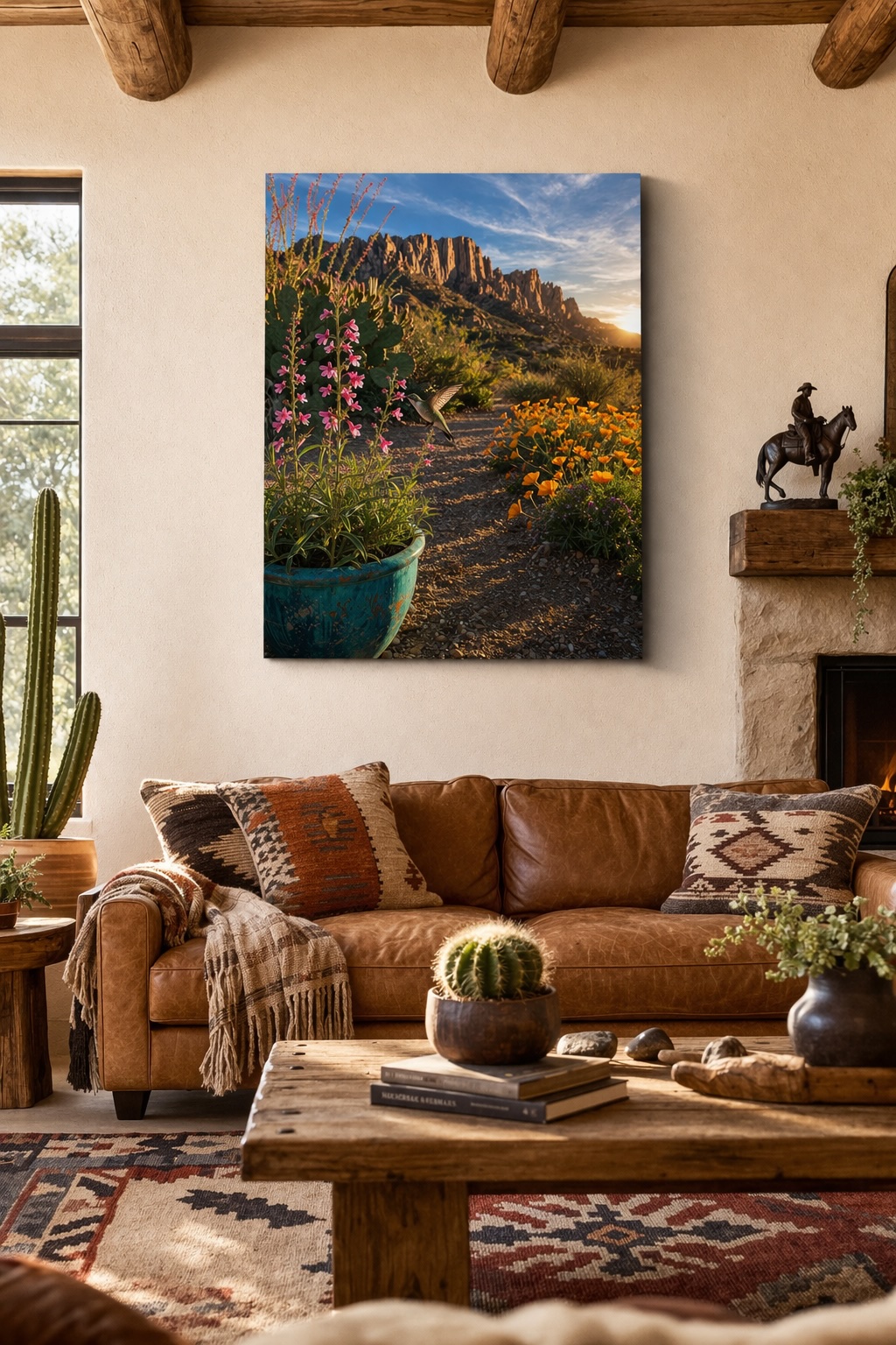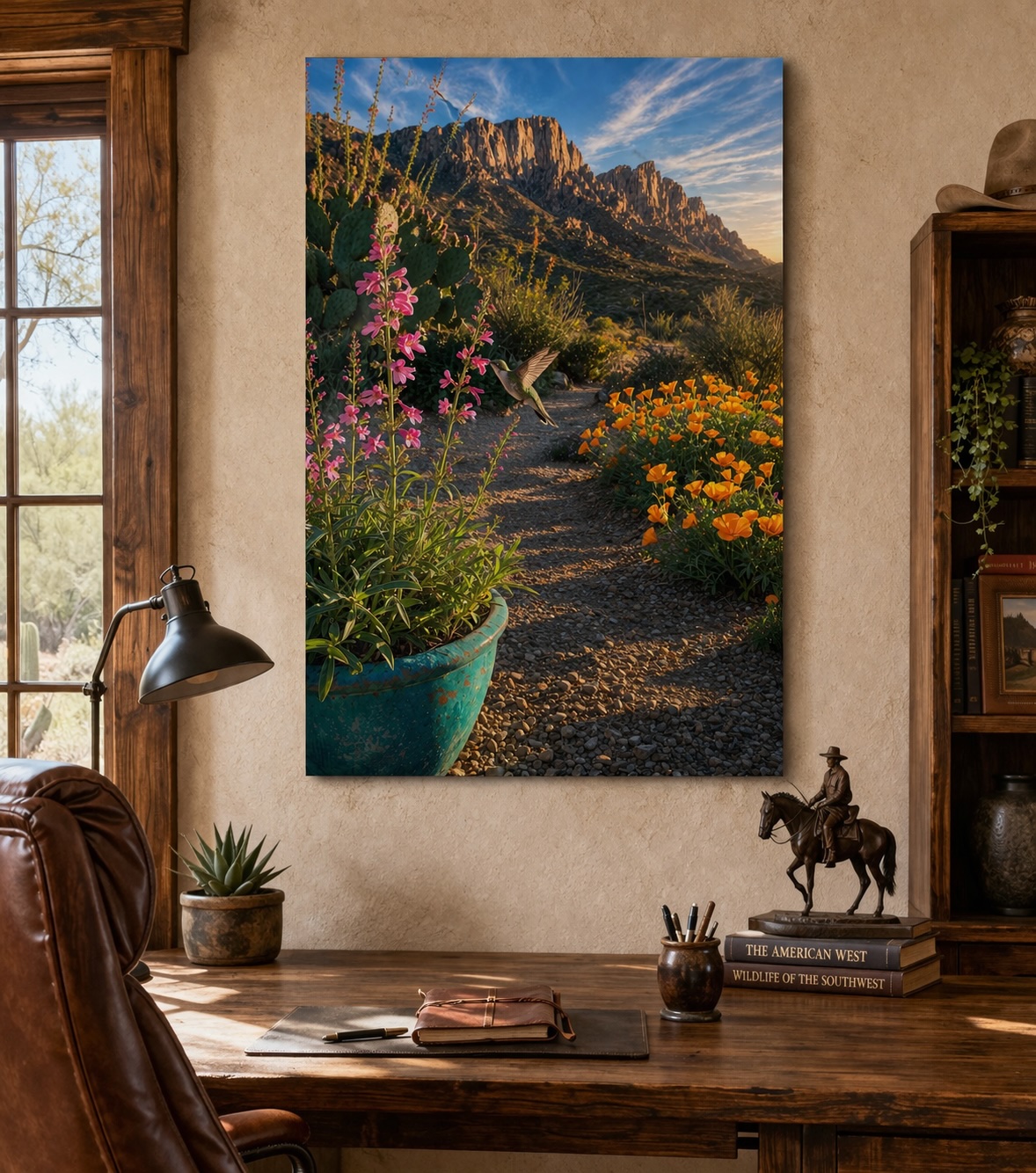 Metal is the signature substrate for Sonoran Art — and it is the recommended format for this piece. Printed directly onto lightweight aluminum with a scratch-resistant surface, metal amplifies the warm desert tones and adds dimensional luminosity to the golden light, the ridge detail, and the hummingbird’s iridescent feathers. Colors appear more vivid than on any paper surface, and the piece arrives ready to display with a French cleat hanging system — no framing required. If you are choosing one format, choose metal.