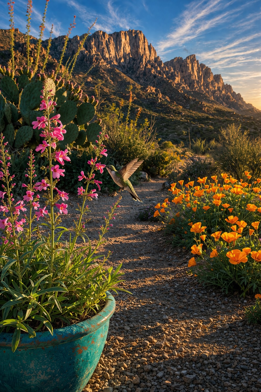 First Light on the Ridge captures that precise moment in a Sonoran Desert garden along the foothills of Oro Valley, Arizona. A weathered turquoise pot anchors the lower left, its penstemon stalks extending upward in vivid magenta. A hummingbird hangs in the warm air, wings carrying the first pulse of morning. To the right, a sweep of Mexican gold poppies holds the sunlight like small lanterns. And beyond it all, rising from the desert floor with unmistakable authority, the vertical cliff faces of Pusch Ridge glow copper and gold against a deepening blue sky.