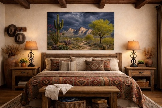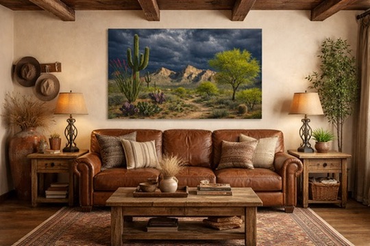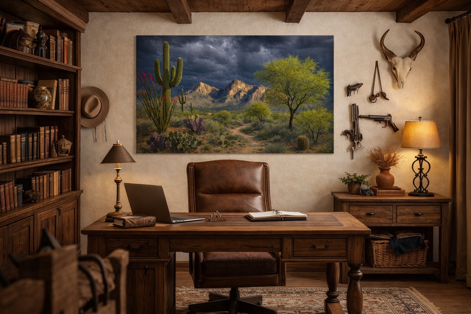 Anyone who has spent a summer in the Sonoran Desert knows the feeling. Storm clouds build on the mountains by mid-afternoon, the air goes still and electric, and then the light changes. Everything turns golden. The saguaros seem to lean into it. That is the moment Monsoon Drama captures.