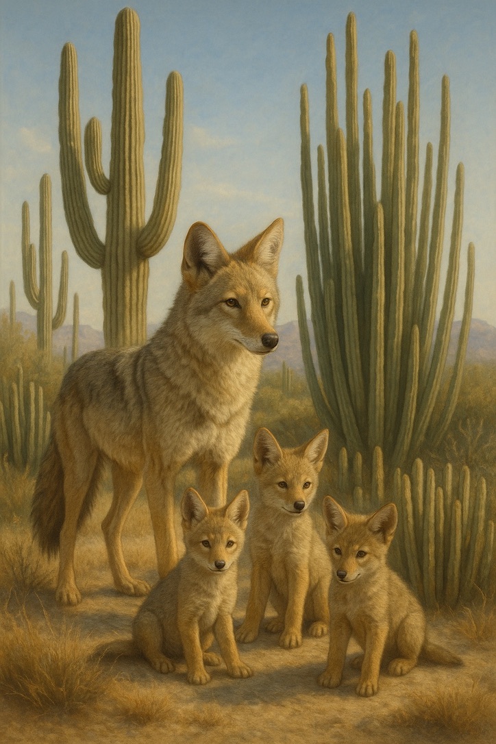 Morning Watch finds a coyote family in that early hour. A mother stands among her three kits beneath the towering silhouettes of saguaro and organ pipe cacti as the soft morning light moves across the desert floor. The fur detail is rendered with the precision that fine art realism demands — the particular texture of a coyote’s coat in early light, the subtle interplay of shadow and warmth that defines the Sonoran Desert at dawn. The kits are close, curious, and entirely dependent on the steady presence beside them. The mother is alert without being alarmed, watchful in the way that mothers are watchful when everything is still all right, but the day is just getting started.